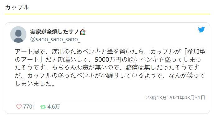美術館に行くと多くの美術品が展示されており、それを見て楽しみますが最近では参加型アートもあり、来た人が参加することができるアートがあります。それと勘違いしたカップルが5000万円もするアートにペンキを塗ってしまったようでそれがこちらです。